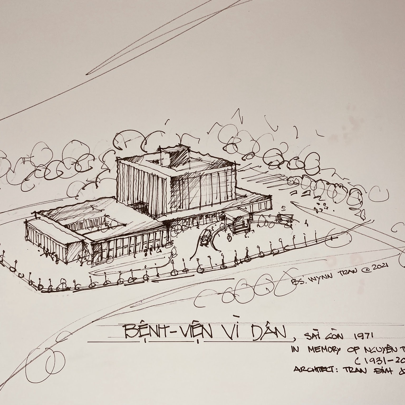 Trong lịch sử kiến trúc và y khoa Việt Nam, một trong những bệnh viện mà tôi ấn tượng nhất là bệnh viện Vì Dân (BV Thống Nhất). Năm 1971, bà Nguyễn Thị Mai Anh, với cương vị là đệ nhất phu nhân VNCH, cảm nhận được sự thiếu thốn các cơ sở điều trị y tế, cảm nhận được khốn khó của người nghèo Sài Gòn; bà đã thành lập một bệnh viện tư miễn phí phục vụ cho người nghèo. Bà đặt tên bệnh viện là "Vì Dân" để nhấn mạnh mục tiêu khám chữa bệnh của bệnh viện. Tuy là bệnh viện tư, có trên 400 giường với trang thiết bị hiện đại nhất vào lúc đó, nhưng bệnh viện Vì Dân hoạt động như một bệnh viện công khám chữa bệnh hoàn toàn miễn phí cho người nghèo. Sau năm 1975, bệnh viện Vì Dân đổi tên thành BV Thống Nhất là nơi chữa bệnh chủ yếu cho quan chức chính quyền VN. Bệnh viện Vì Dân do KTS Trần Đình Quyền thiết kế. Điểm thú vị là KTS Trần Đình Quyền trước khi học kiến trúc lại là sinh viên y khoa Sài Gòn. Học Y khoa đến đầu năm 2, ông bỏ học vì không chích mổ xẻ. Sau đó ông thi lại ngành vào ngành kiến trúc, tốt nghiệp từ trường kiến trúc Sài Gòn. Năm 1960, ông được học bổng UNICEF và bộ y tế VNCH đi tham quan các bệnh viện tại Mỹ. Trong lúc tham quan bệnh viện Mỹ, ông bị gãy chân, được đưa vào phòng cấp cứu BV tại Mỹ để chữa trị. Do là bệnh nhân, được phẫu thuật, và trải qua bao nhiêu phòng ban tại Mỹ, ông nhanh chóng nhận ra thiết kế bệnh viện Mỹ phức tạp nhưng hiệu quả. Sau khi lành chân, ông được cấp học bổng học thiết kế bệnh viện tại trường ĐH kiến trúc danh tiếng Columbia New York. Về nước, ông được bà Mai Anh đặt thiết kế bệnh viện Vì Dân với phong cách hiện đại của BV Mỹ. Lúc bấy giờ, các BV tại VN phần lớn thiết kế theo kiểu Pháp với kiến trúc phân tán các khối như BV Nhi Đồng 2. Trái với phong cách thiết kế này, KTS Trần Đình Quyền áp dụng các nguyên lý thiết kế bệnh viện tại Mỹ, thiết kế các khối chữa bệnh tập trung gần nhau, kết nối BS, y tá, và bệnh nhân bằng các hành lang, thang máy, với mục tiêu BS di chuyển càng ít thì bệnh nhân được chăm sóc hiệu quả hơn. Vấn đề là các BV Mỹ dùng máy lạnh và hệ thống thổi gió để thông gió kiểm soát nhiễm khuẩn trong khối nhà tập trung. Nếu áp dụng cách này vào BV Vì Dân thì sẽ tốn quá nhiều tiền điện và kỹ thuật. Thay vào đó, KTS Trần Đình Quyền dùng các khối không gian lớn hứng gió, thiết kế các bông gió, tạo thông thoáng và nắng tự nhiên để xử lý vấn đề thông gió cho BV Vì Dân. Cách đây vài hôm, bà Mai Anh vừa từ trần tại California. Tôi viết vài dòng, vẽ vài nét kí họa để cảm mến tấm lòng của vị đệ nhất phu nhân Việt Nam Cộng Hòa cũng như tôn chỉ "Vì Dân" khám chữa bệnh của bà khi lập bệnh viện.